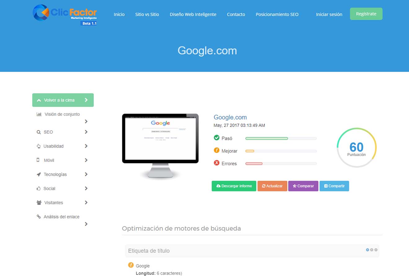 Vamos al grano: ¿Qué es Clicfactor (www.clicfactor.com) y qué hace? EntrepreNerd conversó con Daniel Plaza, su creador, quien nos comentó que éste es “un Sistema de análisis SEO gratis, herramienta que realiza un diagnóstico profundo de cualquier sitio web, orientado a los parámetros que Google considera relevante para posicionar una web en los primeros resultados de búsqueda”.