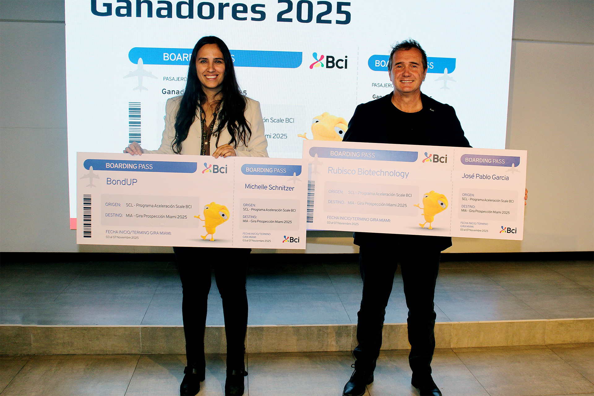 Los finalistas fueron: Wikiflix SpA, Rubisco Biotechnology, Granolín, Eko3, BondUP y Subcargo. Entre ellos, resultaron ganadores BondUP, la primera red social de conexión y entretenimiento para personas mayores de 55 años, que integra actividades, talleres y beneficios en productos y servicios para la llamada generación silver; y Rubisco Biotechnology, empresa de biotecnología dedicada al desarrollo de ingredientes activos naturales a partir de especies nativas, mediante tecnología de cultivos celulares que permite una producción sustentable y escalable con aplicaciones en salud, belleza y cuidado personal.