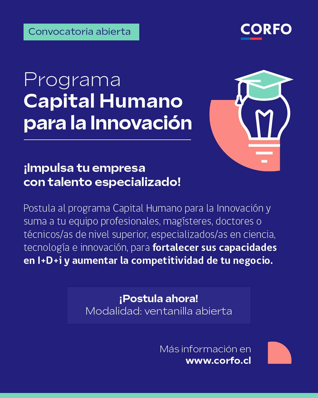 Corfo mantiene abierta la convocatoria del instrumento Capital Humano para la Innovación, que permite que empresas de todos los tamaños contraten talento altamente calificado para desarrollar soluciones basadas en actividades de Innovación, Desarrollo e Investigación (I+D+i). Esta versión suma requisitos más flexibles y busca fortalecer la capacidad innovadora de empresas ubicadas fuera de los grandes centros urbanos.