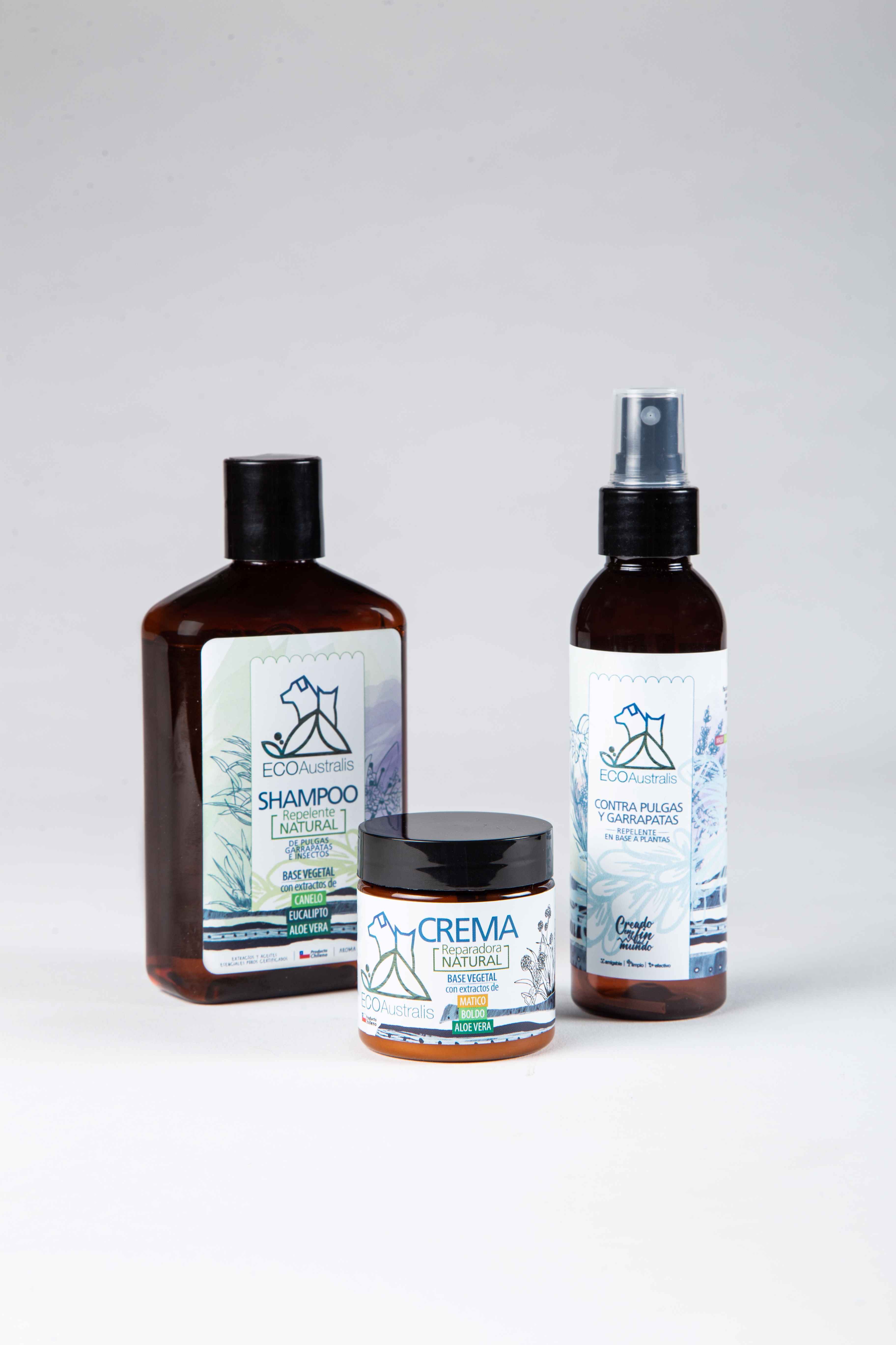 ECOAustralis también cuenta con un Shampoo Repelente Natural, donde los aceites esenciales de canelo y eucalipto ayudan a repeler ectoparásitos como pulgas, garrapatas, piojos y mosquitos, potenciando aún más la acción del spray repelente. Otro integrante es el Shampoo Cuidado Natural, con extractos de quillay, planta que ya era usada por los pueblos originarios, para el lavado del pelo, gracias a la presencia de la saponina cuya corteza posee propiedades detergentes.