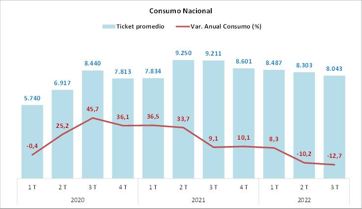 Bajan las ventas, pero también se gasta menos en cada compra. De acuerdo al estudio, el consumo promedio por boleta (expresado en pesos de septiembre 2022), alcanzó un valor de $8.043 en el tercer trimestre de 2022, lo que significó una baja anual de 12,7% real respecto a igual período de 2021, marcando un segundo período de caída, y una baja de 3,1% respecto al trimestre anterior.