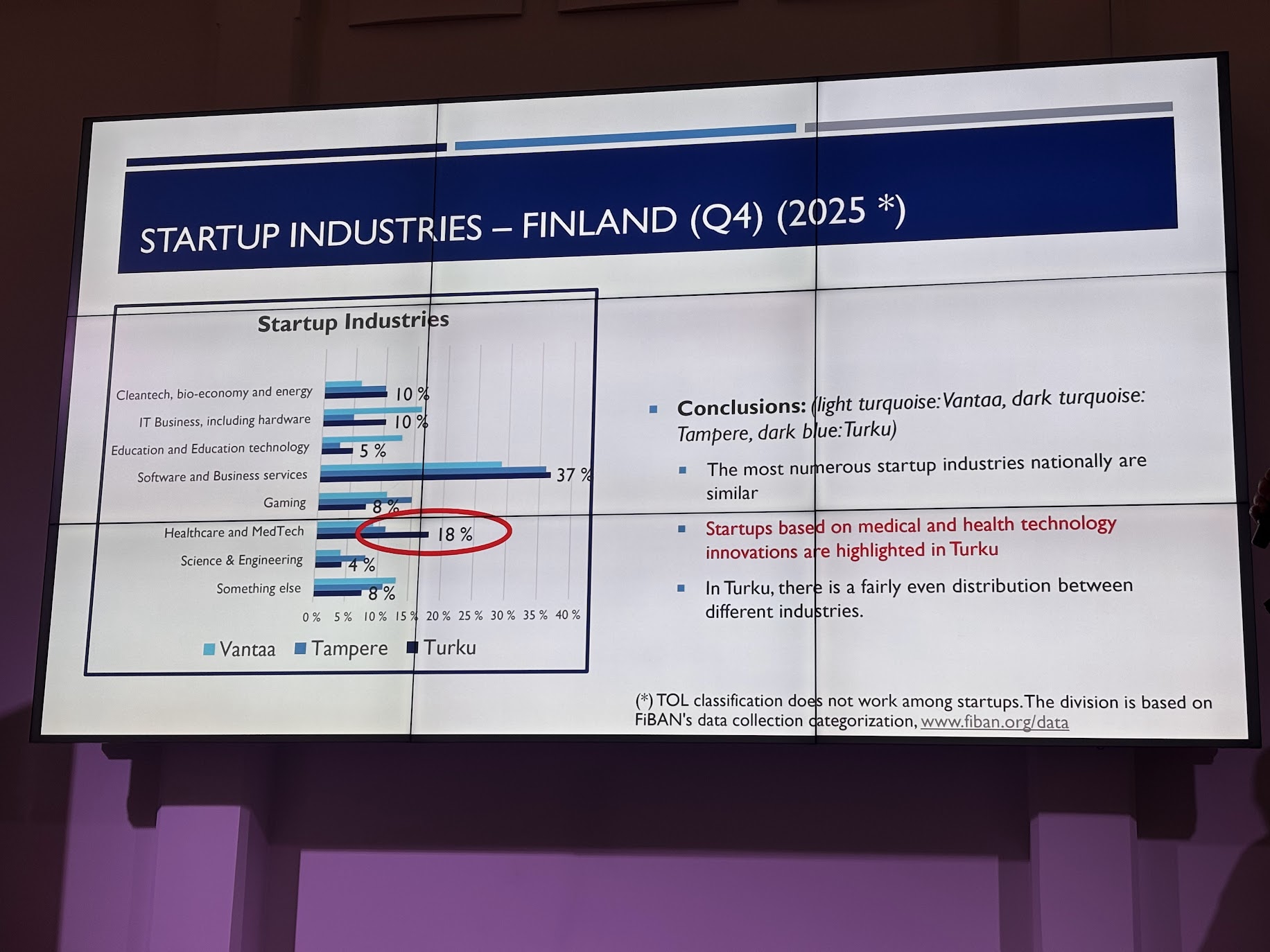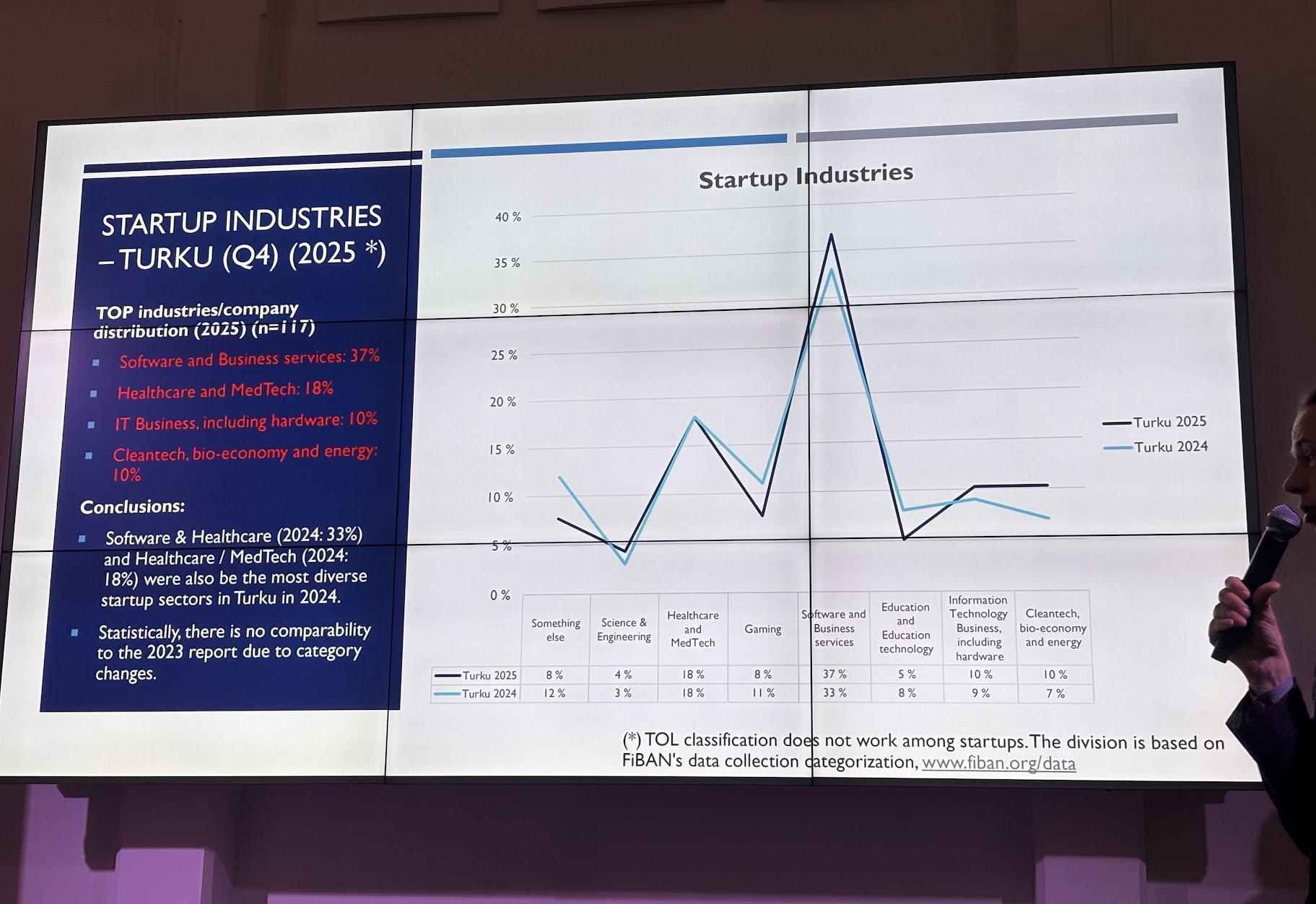 October 2025.- This Wednesday, the results of the third survey measuring the "temperature" of Turku's startup ecosystem were released, comparing the years 2023 and 2024. This time, the sector's growth compared to 2024 is highlighted, with startups focused on Software and Business Services leading the way with 37%, up 4 points compared to the results for 2024 (33%). This is followed by startups in the Healthcare & MedTech sector with 18%; IT Business, including Hardware, with 10%; and Cleantech, Bio-economy, and Energy with 10%; and Science & Engineering with 4%.