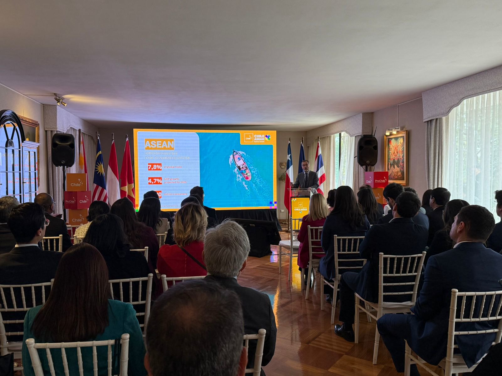 En el lanzamiento de la actividad, realizado en la residencia de la Embajadora del Reino de Tailandia en Chile, el Director General de ProChile, Ignacio Fernández, explicó que "ASEAN nos abre grandes oportunidades de diversificar los mercados de destino para nuestras exportaciones. Hoy estamos exportando cada año cerca de US$ 1.800 millones a este bloque, una cifra que si bien ha ido creciendo, nos muestra que aún tenemos un amplio potencial para aumentar nuestra participación de mercado en muchos productos, como fruta fresca, productos del mar y vinos, además de servicios".