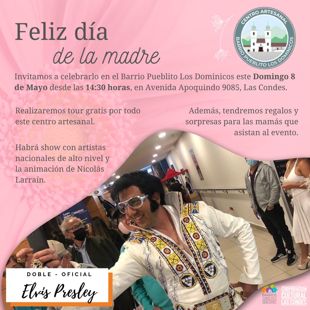 Este domingo 8 de mayo los artesanos y locatarios del Pueblito de Los Dominicos celebrarán en grande a las mamás. En esa jornada, se realizará el evento que comenzará a las 14:30 horas, con la animación de Nicolás Larraín. Se presentarán artistas tales como la cantautora nacional Rayo, además de los dobles oficiales de Juan Gabriel, Cat Steven y Elvis Presley.