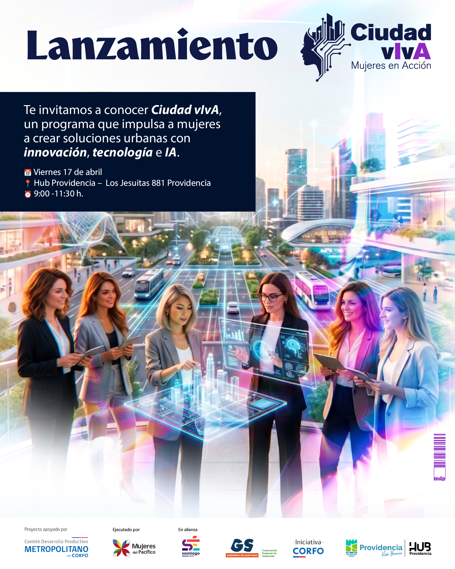 La iniciativa cuenta con el apoyo del Comité de Desarrollo Productivo Regional de la Región Metropolitana —impulsado por Corfo— y es ejecutada por Mujeres del Pacífico, en alianza con actores del ecosistema como Sé Santiago, HUB Providencia y la experta internacional en inteligencia artificial Cecilia Ribecco.