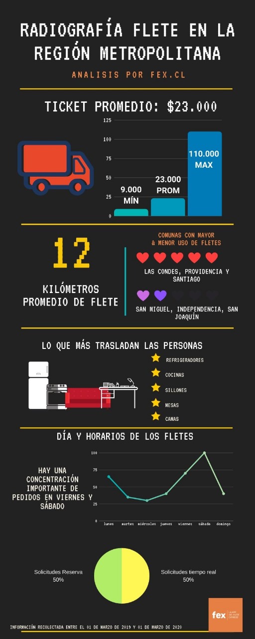 Acá aparece FEX, app hecha y desarrollada en Chile, con machine learning e inteligencia artificial, apodada “el Uber de los fletes”, quienes recientemente y en base a la data acumulada en más de 12 meses de funcionamiento, pudieron sacar una radiografía al uso de este tipo de servicios en la Región Metropolitana.