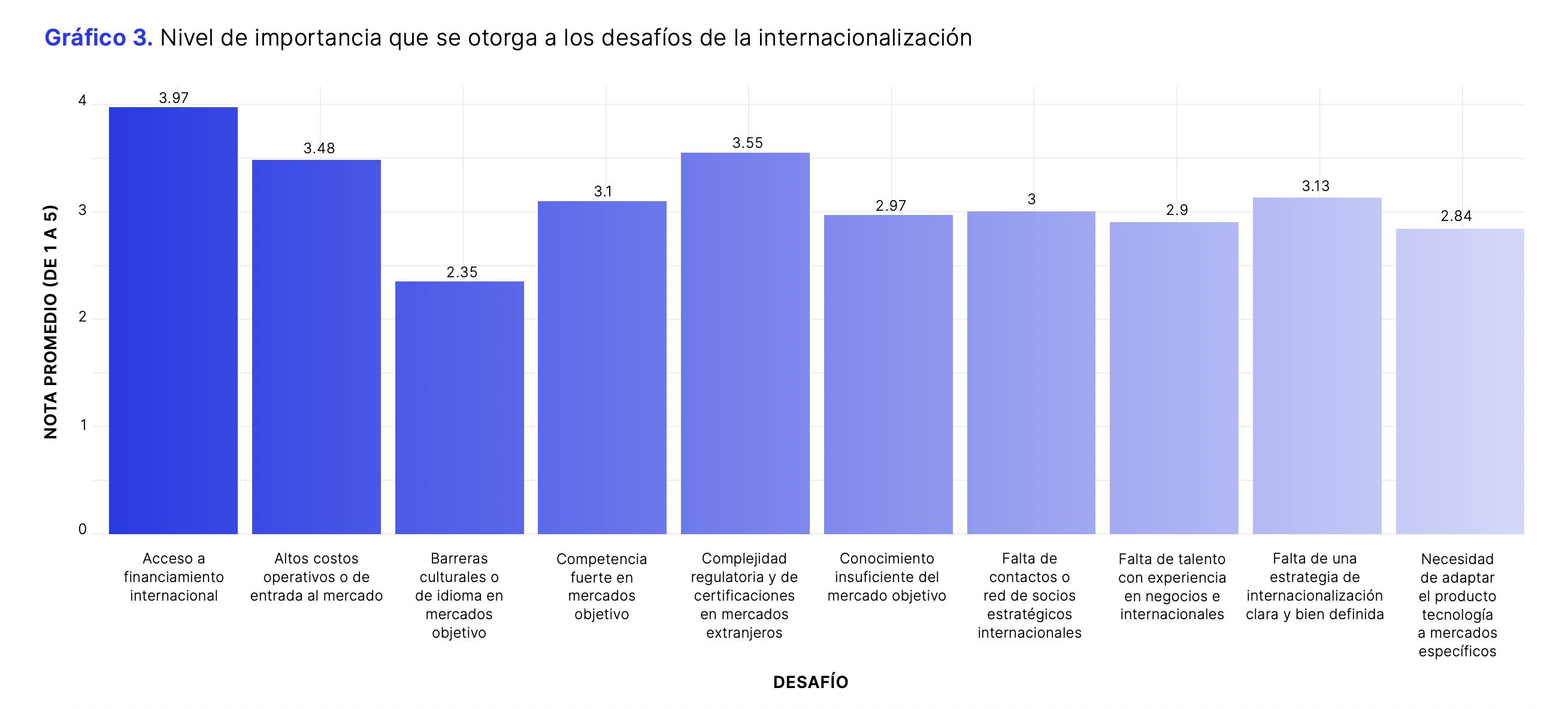 Basado en datos cualitativos y cuantitativos, el análisis dibuja un panorama exigente, siendo el acceso a financiamiento internacional la principal barrera, obteniendo una nota de 3.97 sobre 5. En ese sentido, apenas el 31% de las empresas que priorizan la expansión cuenta con una estrategia para cubrir los costos de internacionalización. Esto se debe en parte a la tendencia de los inversionistas a concentrarse en proyectos con mayor madurez tecnológica deja sin capital a compañías en fase de escalamiento productivo o comercial.