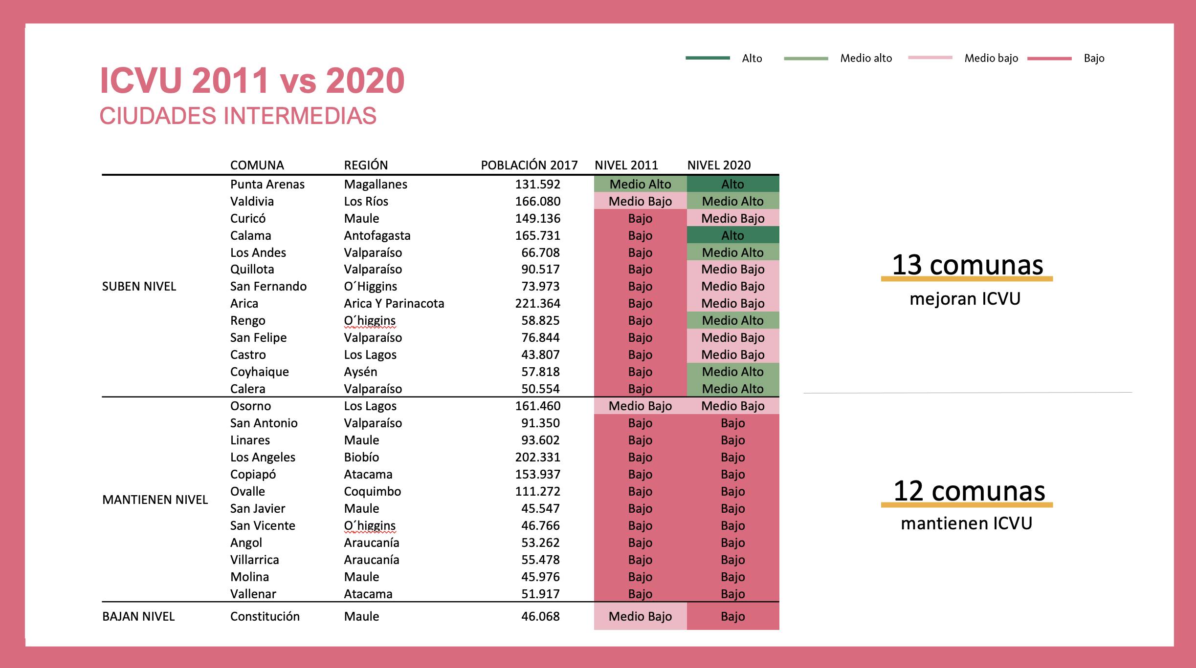 Respecto de la evolución en los últimos 10 años, el ICVU muestra que, del total de 99 comunas evaluadas, 30 registran importantes avances en su calidad de vida urbana, la mayoría de las cuales corresponde a “Ciudades Intermedias”, las cuales se caracterizan por tener menos de 250.000 habitantes y en las que se concentra el 18% de la población total evaluada por el ICVU. En esta categoría destacan Punta Arenas, Valdivia, Calama, Los Andes y Coyhaique, entre otras.