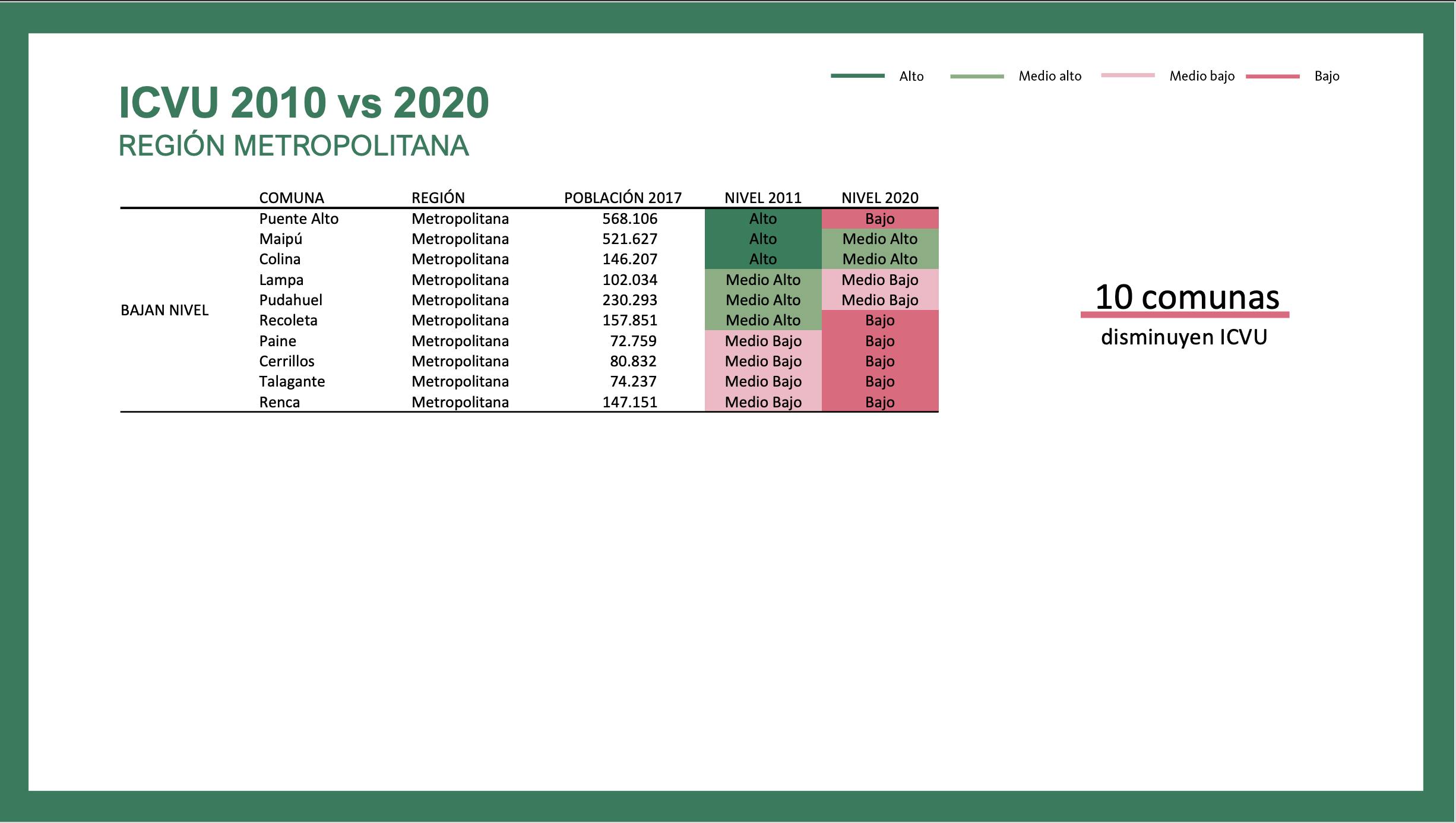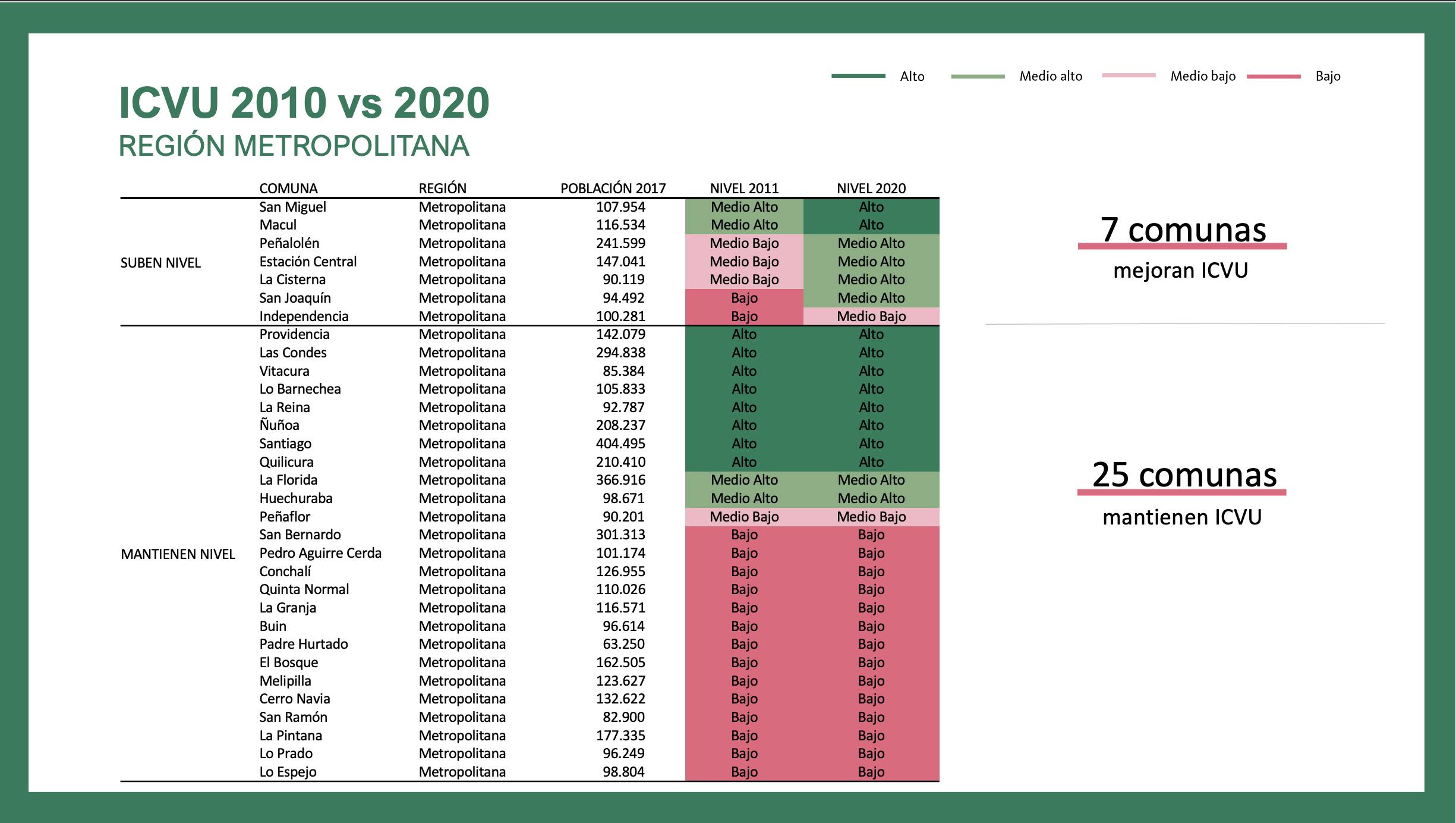 De las restantes comunas, diez presentan los mayores retrocesos en esta medición, lo que significa que la población que vive en comunas de la Región Metropolitana con bajo nivel de calidad de vida urbana aumentó de 30% en 2011 a 42% en la actualidad.