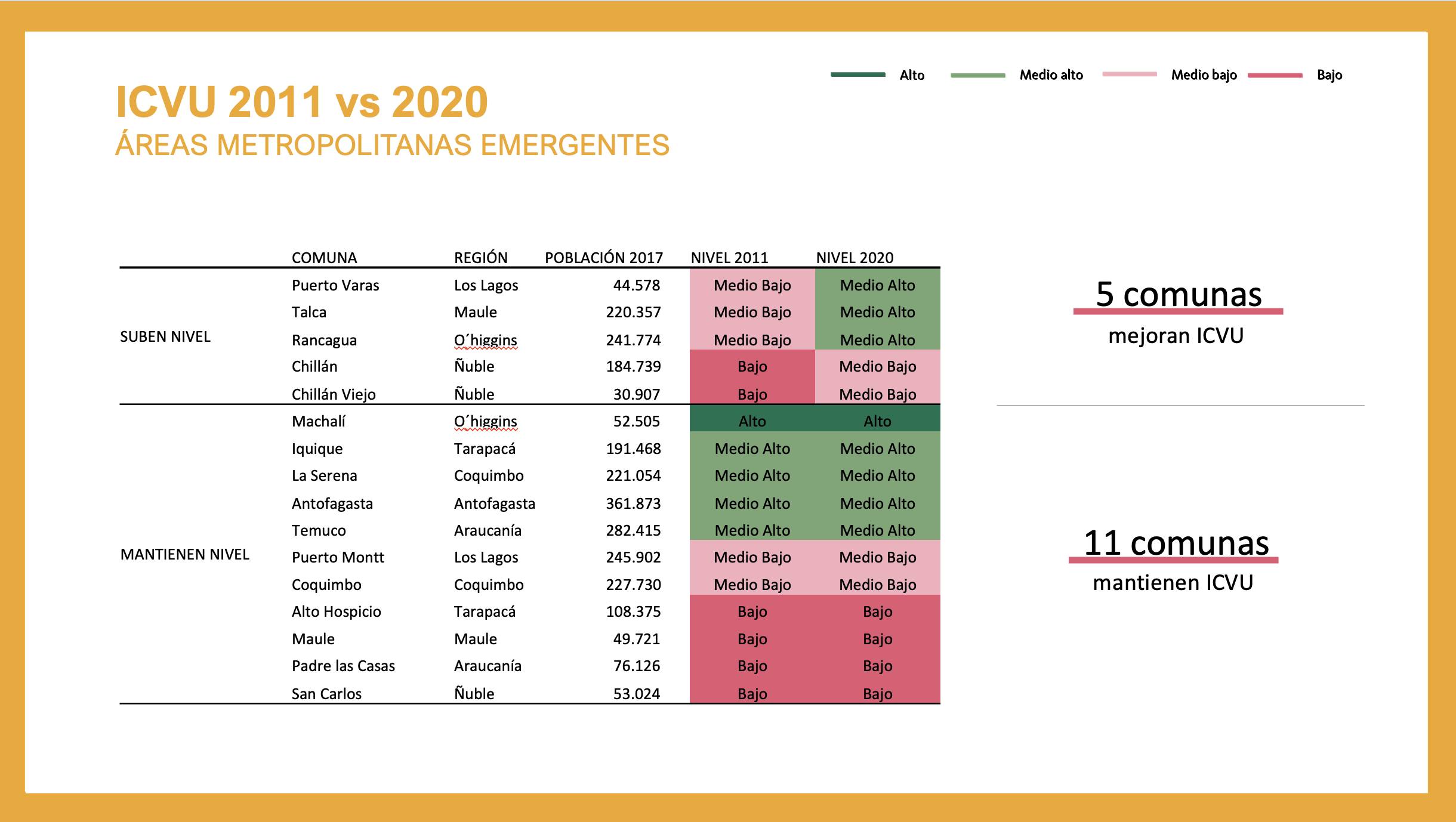 En las “Áreas Metropolitanas Emergentes” –que corresponden a ciudades que en corto plazo serán reconocidas como áreas metropolitanas y que suma 16 comunas, en las que vive el 19% de la población– se observa que 11 de ellas mantuvieron su calidad de vida urbana y 5 de mejoraron, siendo destacables los casos de Puerto Varas, Talca, Rancagua, Chillán y Chillán Viejo.