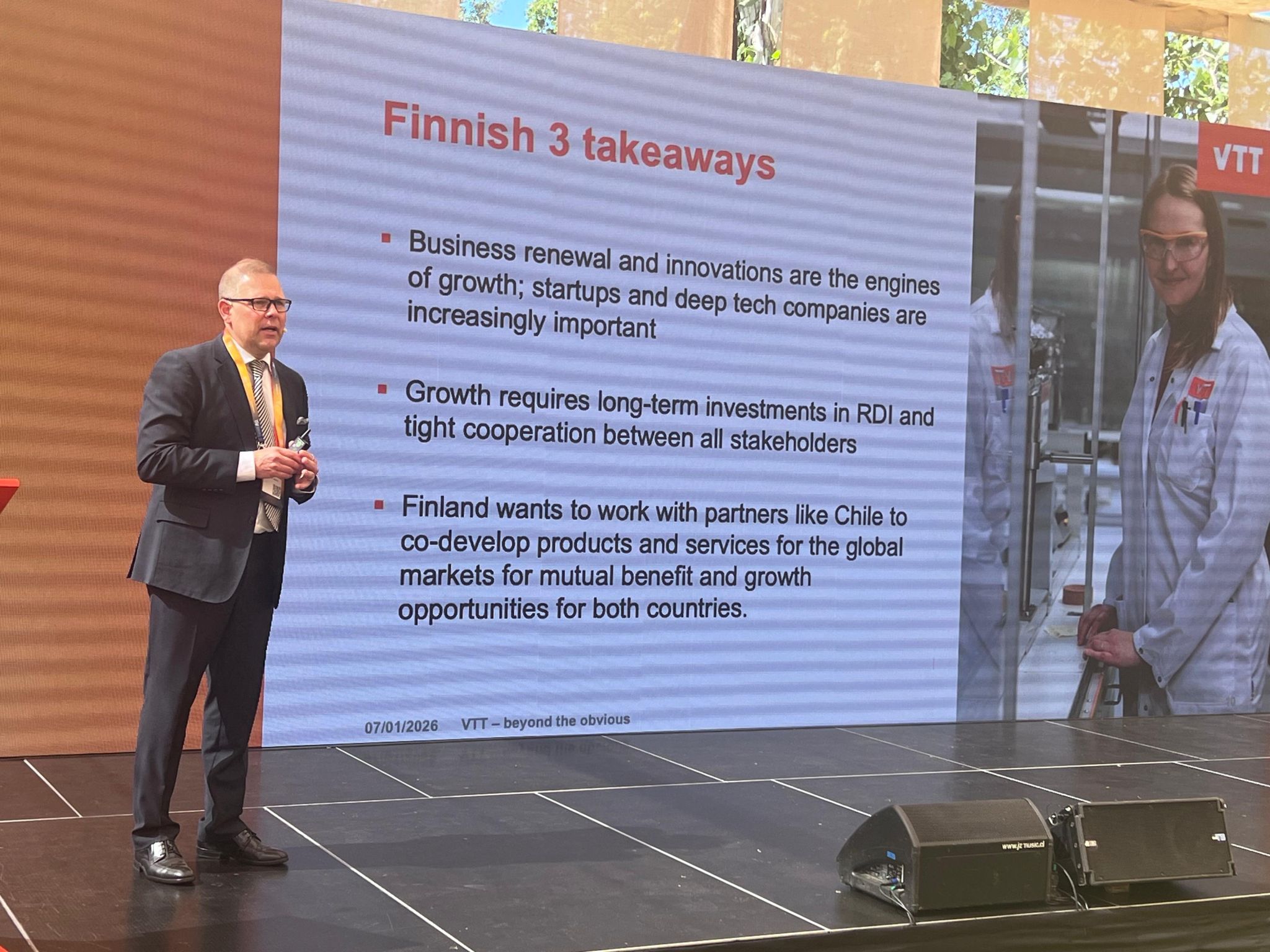 Kalle Härkki, president and CEO of VTT, explained to Entreprenerd the importance of the announcement of the work guidelines in this first year of the implementation of the Chile-Finland Bi-national Platform. "It's extremely important that we manage to translate technological knowledge and research into market applications and real results for businesses. A key aspect is connecting new initiatives and startups with technological knowledge. That's a fundamental part of the challenge".