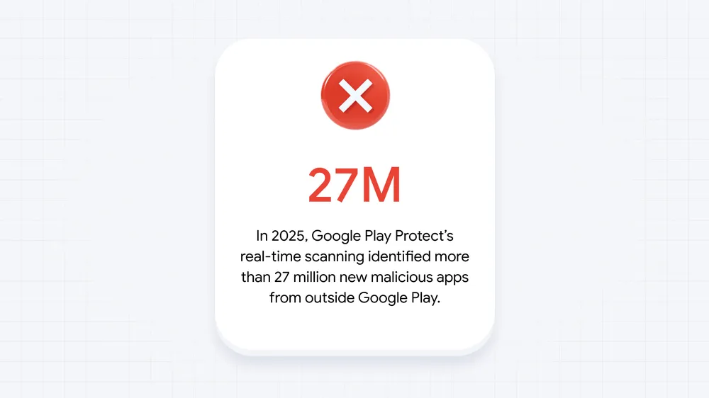 Google Play Protect continues to evolve as Android's integrated defense, scanning over 350 billion applications per day. Thanks to its real-time protections, the system identified over 27 million new malicious apps outside the official store in 2025.